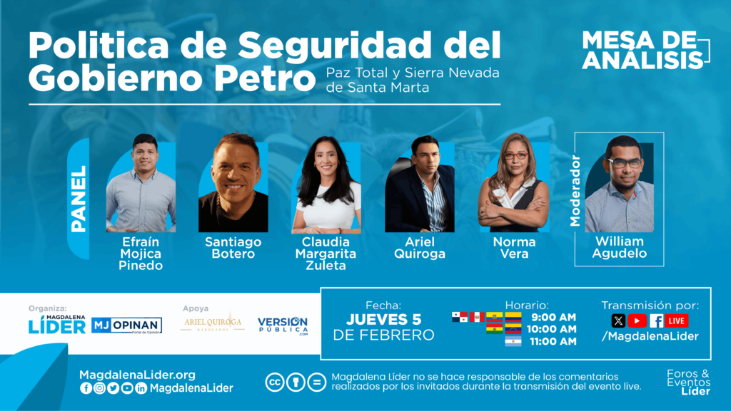 Santa Marta, Magdalena. El centro de pensamiento Magdalena Líder realizará una nueva Mesa de Análisis dedicada a examinar el balance, los retos y los escenarios de la política de seguridad del Gobierno del presidente Gustavo Petro, con especial atención a sus efectos en los territorios del Caribe colombiano. El espacio busca generar una reflexión plural sobre cómo recibió el país el actual gobierno en materia de seguridad, cómo lo entrega y cuál ha sido el impacto de la estrategia de Paz Total, particularmente en regiones estratégicas como la Sierra Nevada de Santa Marta y la Serranía del Perijá, zonas donde convergen dinámicas de conflicto, economías ilegales y procesos de construcción de paz. La conversación permitirá ofrecer a la ciudadanía elementos de análisis para comprender los avances, desafíos y lecciones que deja el actual gobierno en materia de seguridad y los retos que deberá enfrentar la próxima administración nacional. La mesa contará con la participación de Santiago Botero, candidato presidencial; Claudia Margarita Zuleta, abogada, exdiputada del Cesar y candidata al Senado; Efraín Mojica, constructor de paz y candidato a la Cámara de Representantes por el Magdalena; Norma Vera, investigadora en crimen organizado y magíster en Derecho Internacional Humanitario; y el analista y columnista Ariel Quiroga. La conversación será moderada por el periodista William Agudelo, corresponsal de Blu Radio en Santa Marta y CEO de Versión Pública. Desde Magdalena Líder se reafirma el compromiso de promover estos espacios de debate público desde el Caribe colombiano, convencidos de que Santa Marta y el Magdalena pueden convertirse en escenarios de las grandes conversaciones nacionales, aportando análisis y propuestas desde los territorios. Asimismo, el encuentro se inscribe en una visión de integración estratégica entre los departamentos de Magdalena, Cesar y La Guajira, territorios históricamente vinculados como el antiguo Magdalena Grande, que comparten desafíos y oportunidades en materia de seguridad, desarrollo y construcción de paz alrededor de la Sierra Nevada de Santa Marta. La Mesa de Análisis se transmitirá en vivo a través de las redes sociales de Magdalena Líder, permitiendo la participación de ciudadanos y audiencias interesadas en comprender el presente y futuro de la seguridad en Colombia. Siga la transmisión en el canal de YouTube